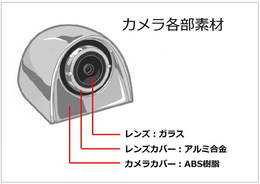 エビアイカメラ(S506 / M1 / D1 シリーズ)は、すべて共通の素材構成で設計されています。各部位には、車載環境に適した最適素材を採用しています。